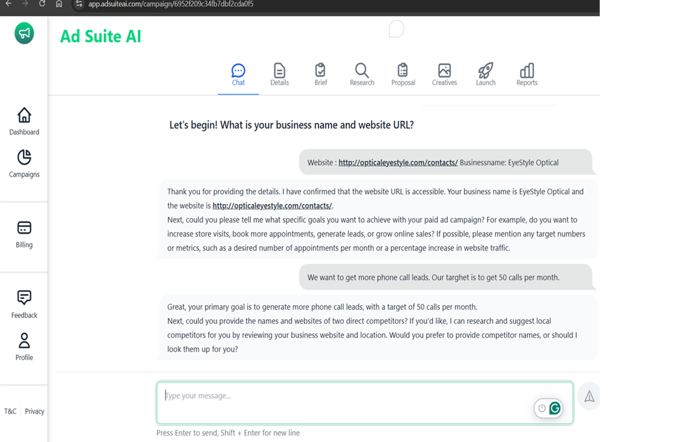 Chat with Ad Suite AI to share your website, campaign goals, and which service or product you want to promote.